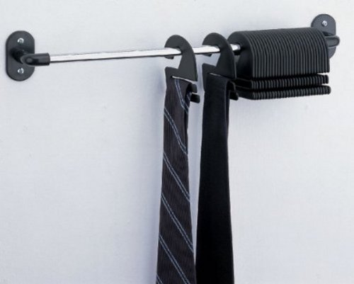 About Organize It All Chrome Wall-Mounted Tie Organizer:Keep your neck ties and scarves tidy and organized with this wall mounted tie rack! This tie organizer mounts easily to the closet wall or under a shelf to neatly store neck ties, scarves and belts! Simply affix the rod, and then hang ties and scarves from the removable hangers. When its time to get ready for work, youll find your accessories easy to reach and easy to put away! The chrome bar provides ample space in between ties, preventing wrinkling. Hardware included. Holds 30 ties. Sorry extra hangers not available. Extends approximately 2.75 inches from wall. Pick one up today, and let the organization begin!